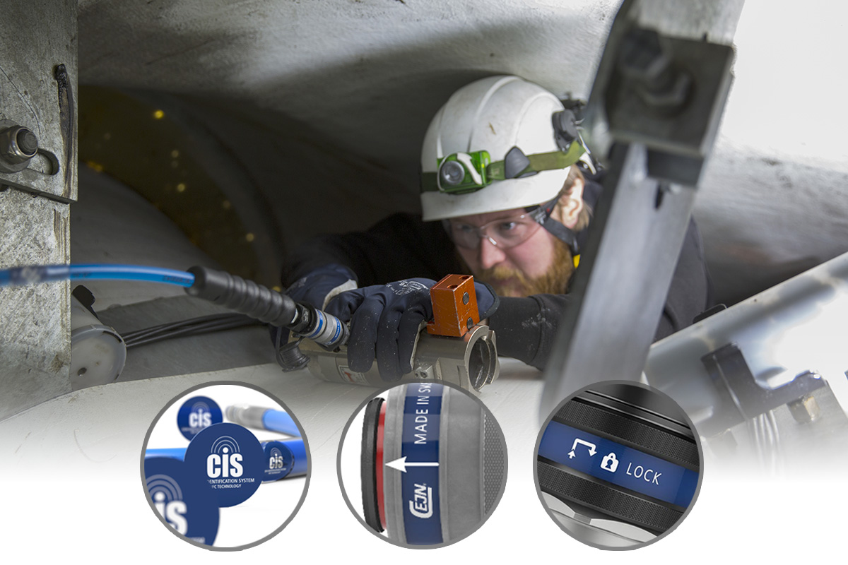 CEJNs højtryksslanger og lynkoblinger er anerkendte for deres høje sikkerhedsniveau og ydeevne. Lynkoblingerne har unikke sikkerhedsfunktioner såsom en alarmring, der tydeligt indikerer, om tilslutningen er sikker og en sikkerhedslås som en ekstra sikkerhedsforanstaltning. Derudover kan slangerne udstyres med CiS, som muliggør sikkerhedsinspektion af slangesæt for at verificere kvaliteten af dit udstyr. Takket være disse funktioner er CEJNs højtrykskoblinger og slangesæt det perfekte valg til sikker boltebespænding i trange rum såsom vindmøller.
