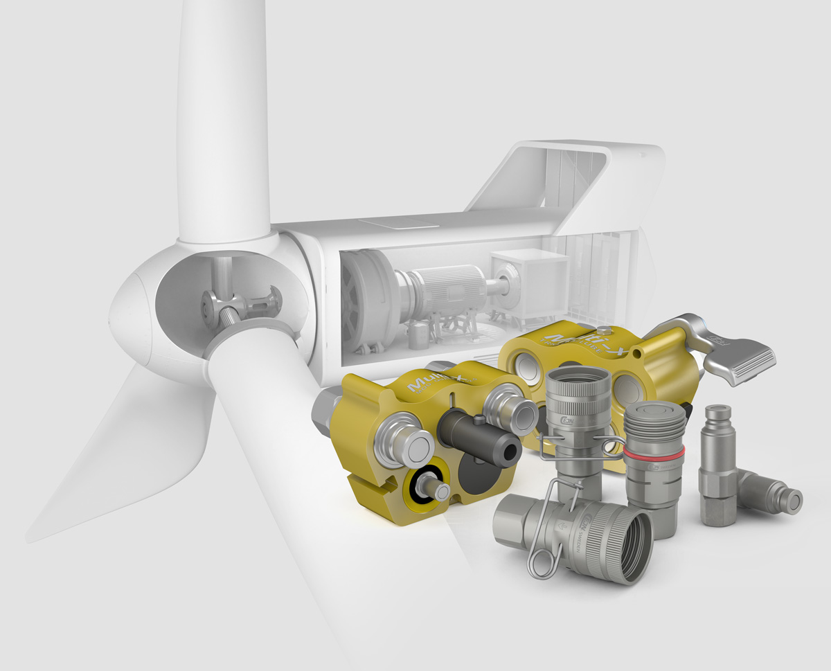 - Hydrauliske lynkoblinger til installation, vedligeholdelse og styring af vindmøllens hydrauliksystemer.