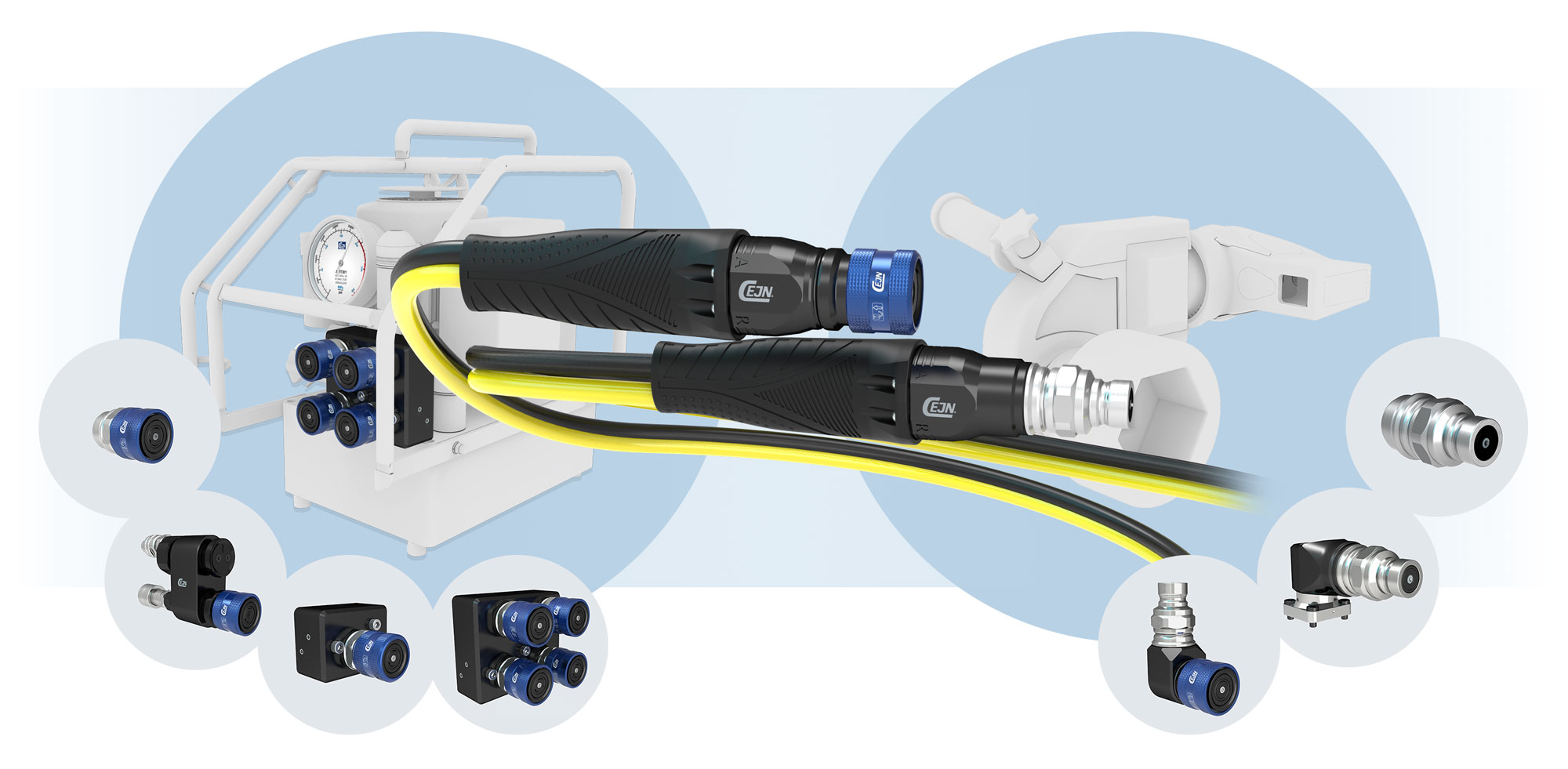 Alle hydrauliske pumper kan udstyres med T-Coax koaksialkoblinger, hvilket muliggør spildfri til- og frakobling samt nem og effektiv brug. Tilslutningsblokkene kan integreres i producentens pumpedesign, og koaksialadapteren opgraderer eksisterende pumper med koaksialforbindelser.