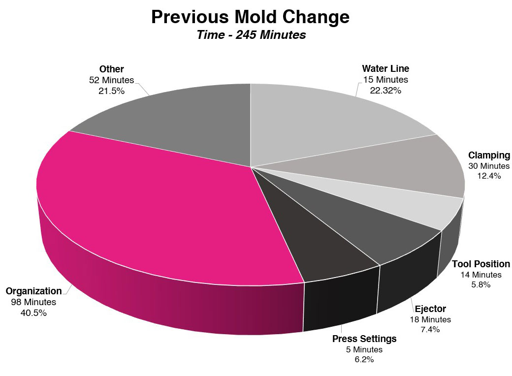 In another cost breakdown (Figure 2*), clamping is shown to be the fourth largest cost associated with changeover at 12.4% of the die change. This study also shows Water Lines as 22.32% of changeover time. Combined these add up to 34.73% or 45 minutes.