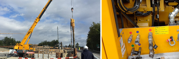 vibrating, the individual sheet piles are vibrated, and thus loosen the soil material and can penetrate into the soil. The Vibro Hammers are used either freely suspended on a crawler crane, on a mobile crane, or drill rig, fed by a power pack. With these tools, the CEJN TLX screw couplings come into play.