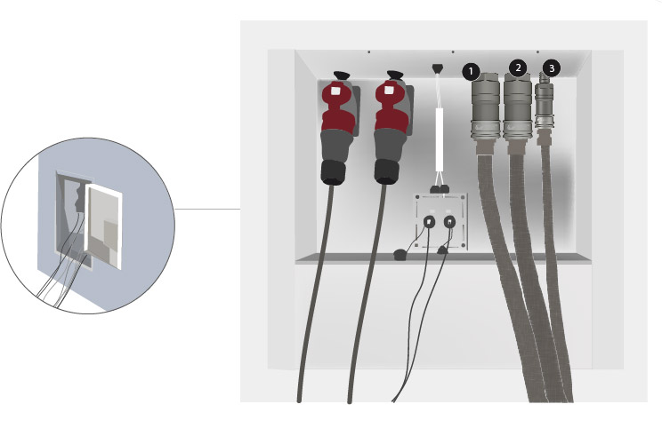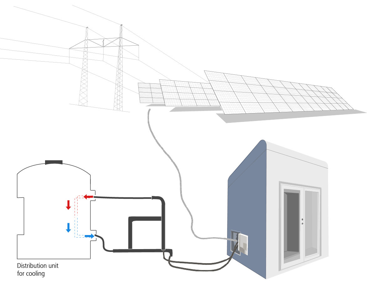 - Il modulo è collegato ad una microgrid di alimentazione e raffreddamento che consente l'ottimizzazione del funzionamento, per esempio per l'utilizzo di fonti di energia rinnovabile come la foto tensione prodotta localmente e il free cooling. La fonte primaria di raffreddamento entra nell'unità di distribuzione e poi ritorna di nuovo nel modulo.