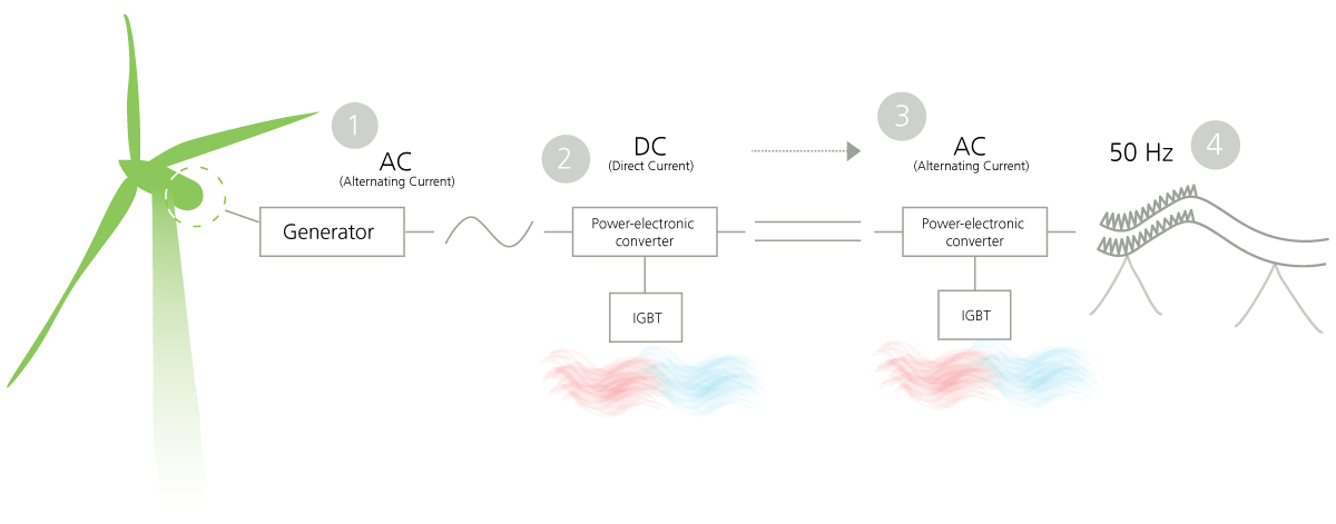 La parte critica in un convertitore di potenza elettronico è il transistor elettronico, es. IGBT (Insulated Gate Bipolar Transistor). La consistente generazione di calore spesso richiede un sistema di raffreddamento a liquido per la gestione termica. Di seguito è riportato lo schema di una sequenza di eventi che si verifcano nella conversione della corrente attraverso un transistor elettronico in un convertitore elettronico di potenza:
