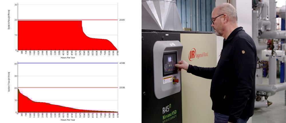 I dati rilevati da LMS Nordic, dell'aria compressa prodotta prima (grafico in alto) e dopo (grafico in basso) l'installazione delle connessioni CEJN eSafe e tubi flessibili.