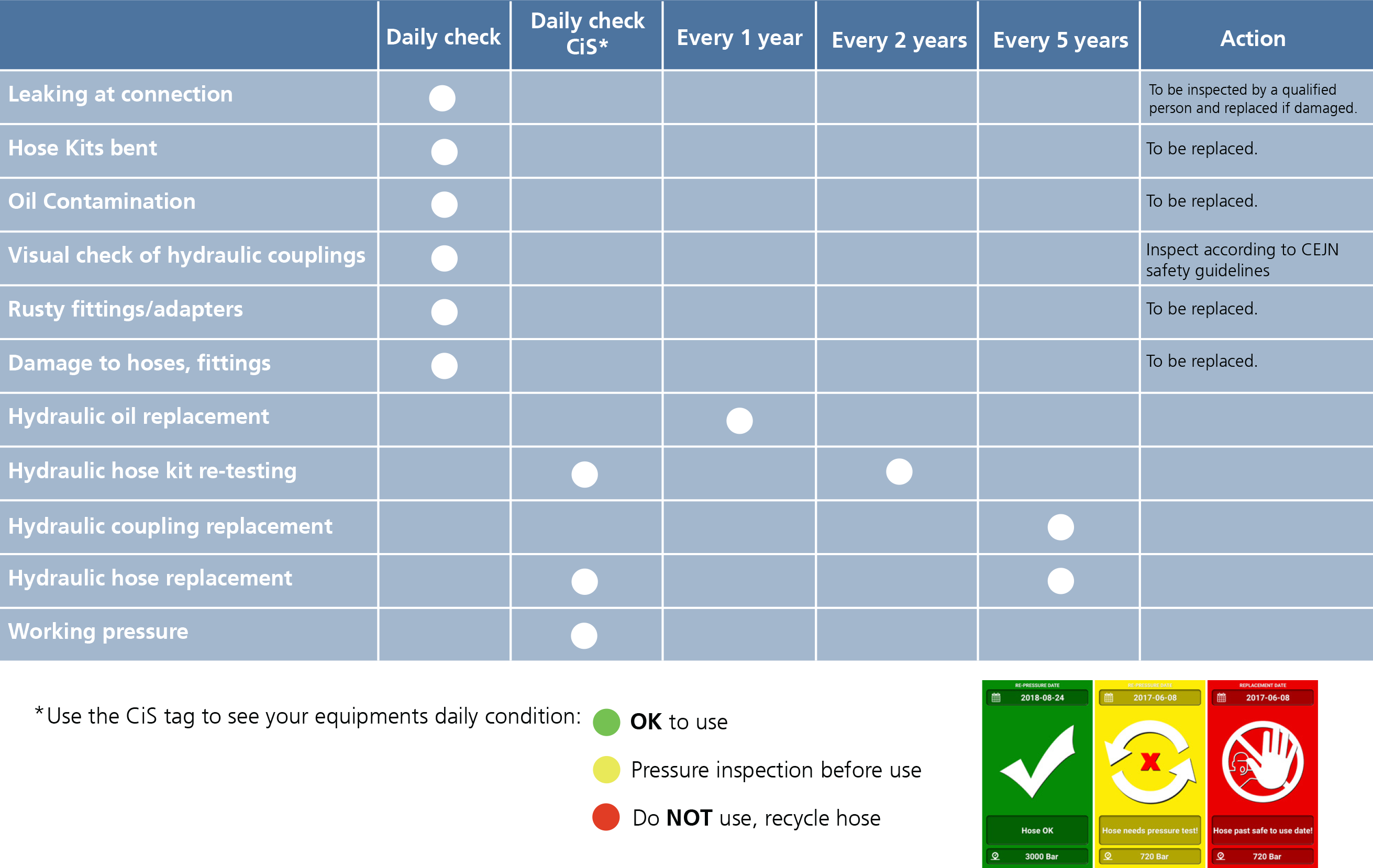 In CEJN, ciascun kit tubo viene testato in pressione prima della consegna per garantire un funzionamento sicuro e prestazioni ottimali. Dopo la consegna è importante che il tubo assemblato venga sottoposto a prove di pressione ed ispezionato regolarmente per assicurarsi che non sia danneggiato o usurato.