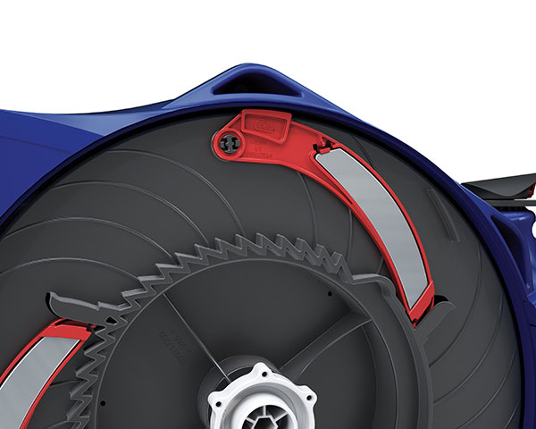Un sistema frenante controlla la forza della molla per un riavvolgimento lento e sicuro.