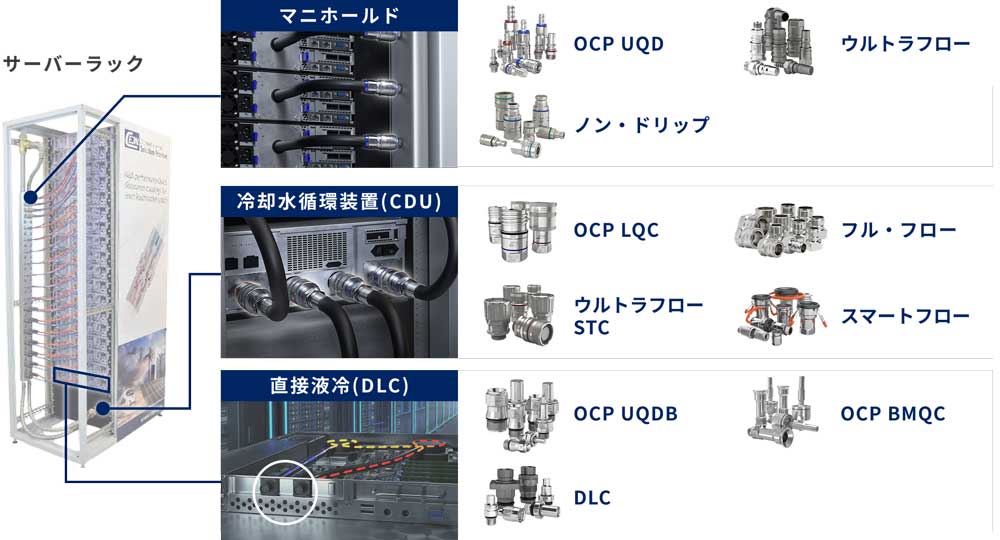 OCP (Open Compute Project) プロジェクト内で開発された世界標準規格(UQD、LQC、UQDB、BMQC)に準拠した4シリーズのほか、セイン独自の「低圧力損失・大流量・液だれなし」を特長とするデータセンター向け液冷用カップリングを展示いたします。実物を比較しながら、ご相談いただけます。ぜひ弊社ブースにお立ち寄りください。