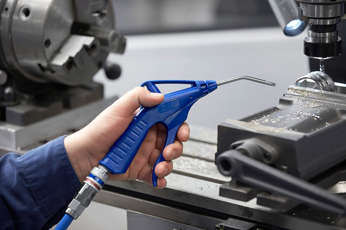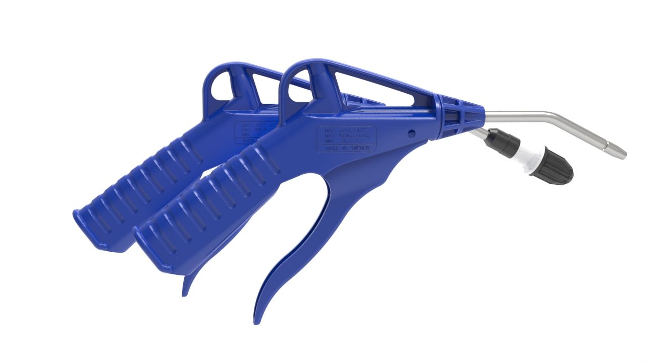 The 208 blow gun is the de facto standard for compressed air blow guns, engineered for high flow performance and comfort. The 208 features a lightweight and robust body and a smart ergonomic design to allow multiple grip positions and storage options. OSHA compliant versions are available and there is a large selection of nozzles available, also including multiple OSHA compliant safety nozzles.